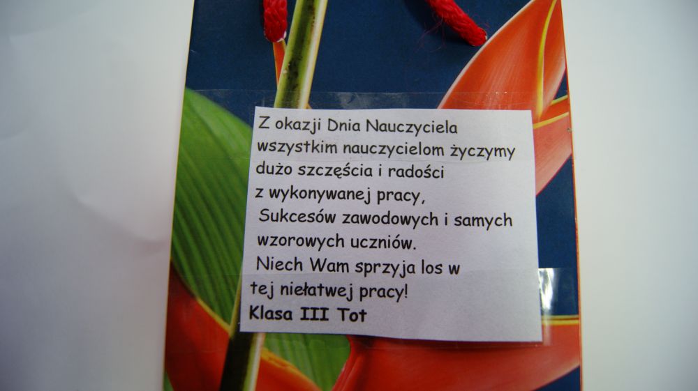 Były to róże wykonane własnoręcznie przez przewodniczącą SU, Emilię Myszkowską z klasy IV TOT oraz woreczki słodkości - rozmaitości, które wykonała zastępczyni przewodniczącej SU, Agnieszka Wodnicka z klasy III kucharz.
